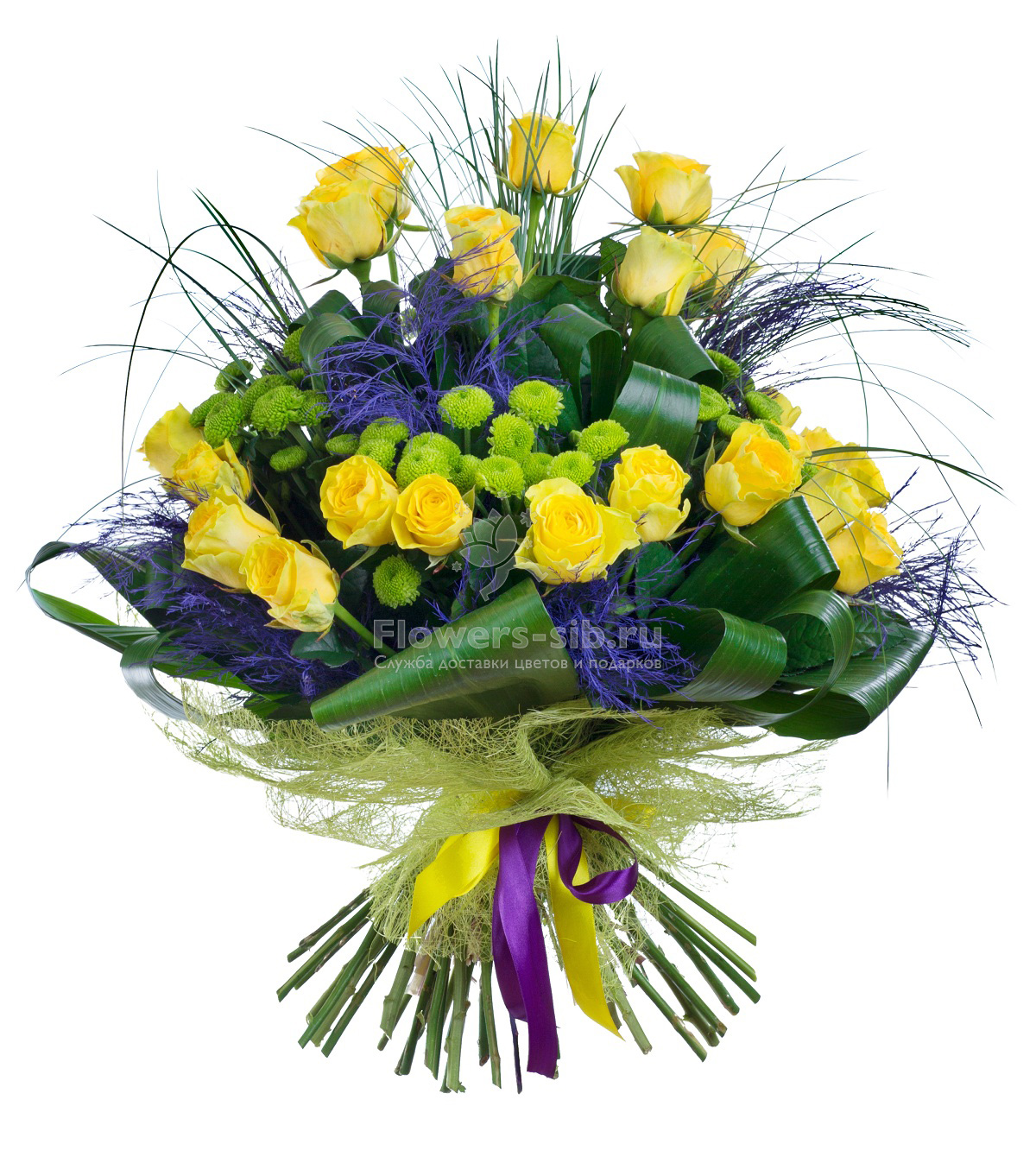 An elegant pyramid-shaped bouquet of yellow roses, chrysanthemums and greenery can be a great gift for a successful woman.